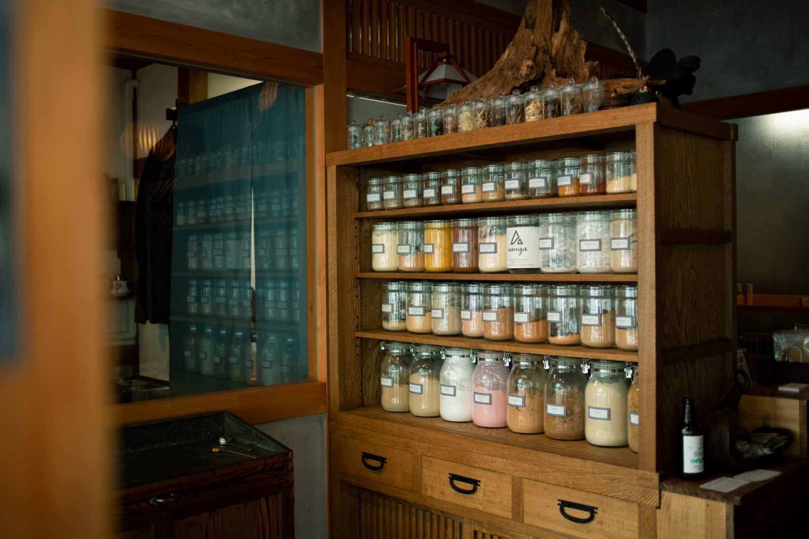 工房の棚に並ぶ、たくさんの香料。これらを練り込んで、オリジナルの線香が作られる。