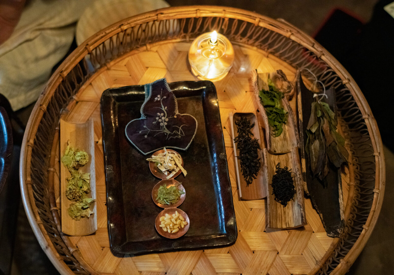 数種類の茶葉が並ぶ円卓、個性がひかる茶器やうつわ。目を開けると、そこには見たことのない小さな世界が広がる。国内外を訪ね集めた中国茶を軸に、堀口さんが自ら製茶した季節の植物を味わうひとときがはじまった。