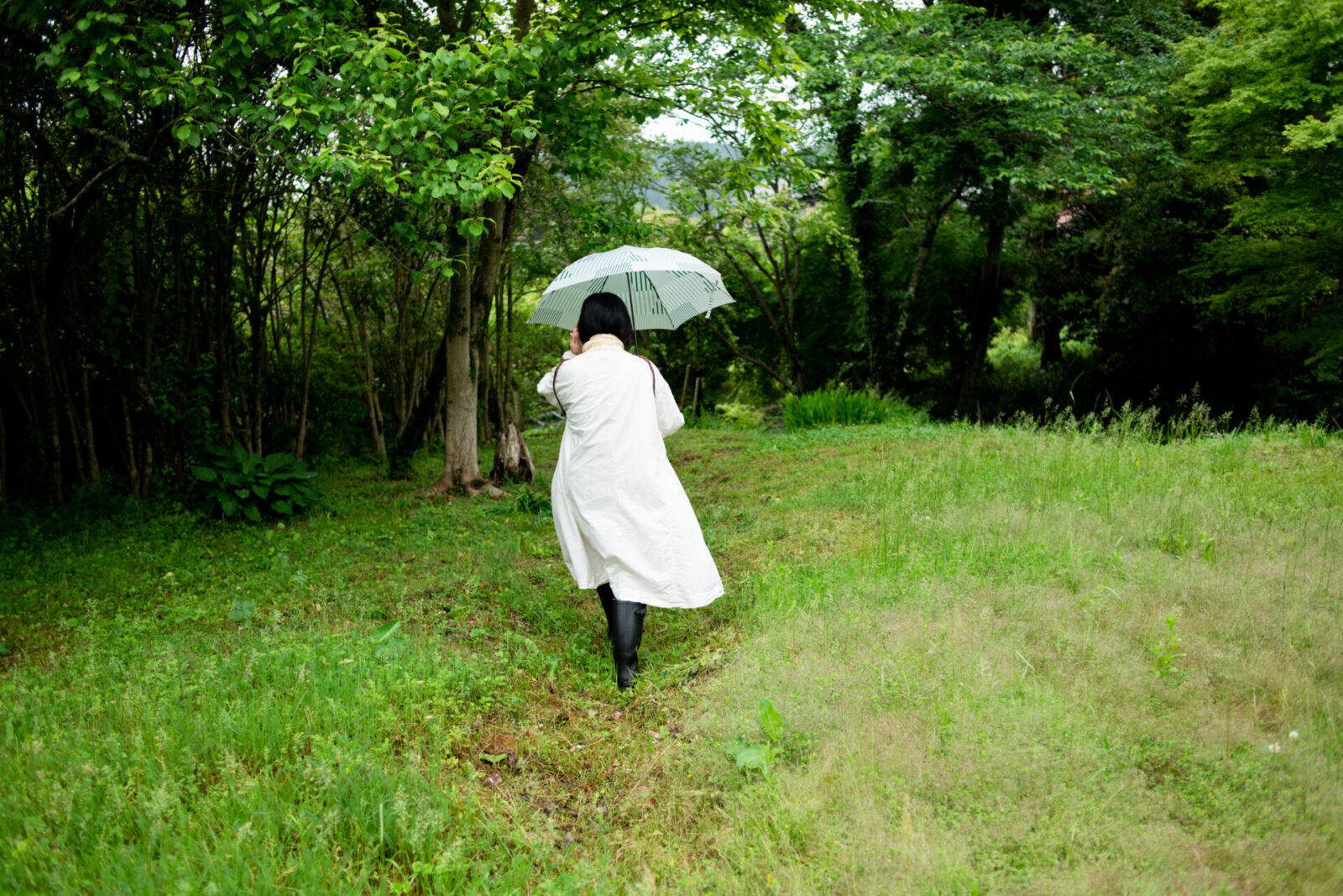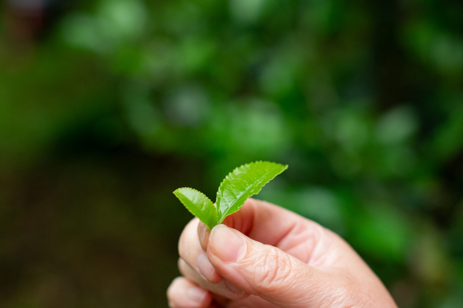 ときおり小雨がぱらつくなか、堀口さんは足取り軽やかにお茶の樹に向かうと、芽吹いた新茶を摘んでいく。