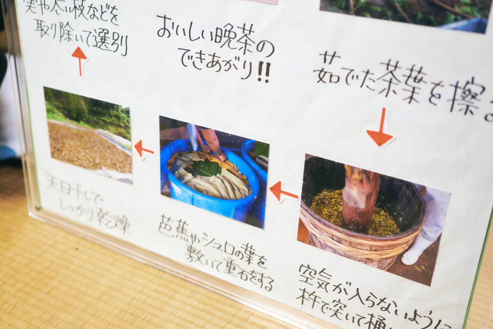 ここで阪東さんは、阿波晩茶の茶摘みから製茶までの、大まかな流れを教えてくれた。