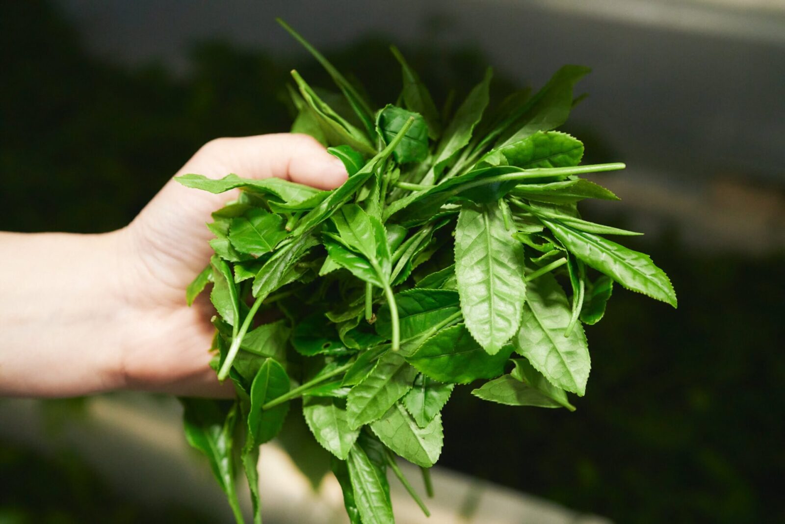 工場に運び込まれたのは、数時間前に摘まれたばかりの茶葉。若い、爽やかな香りが立ち込める。ひと掴みするとほんのりとしたあたたかさを感じ、まるで人肌のよう。