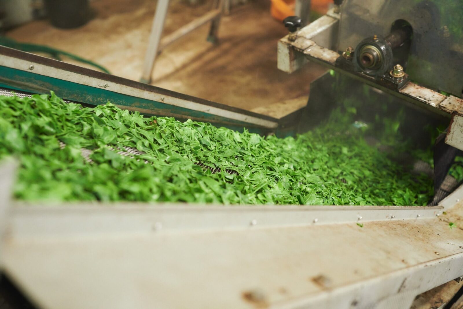 最後は熱風にあてる乾燥機を通して茶葉の水分量を生葉の5%程度にまで落とし、茎や枯葉を取り除いて選別すれば「荒茶」の完成である。