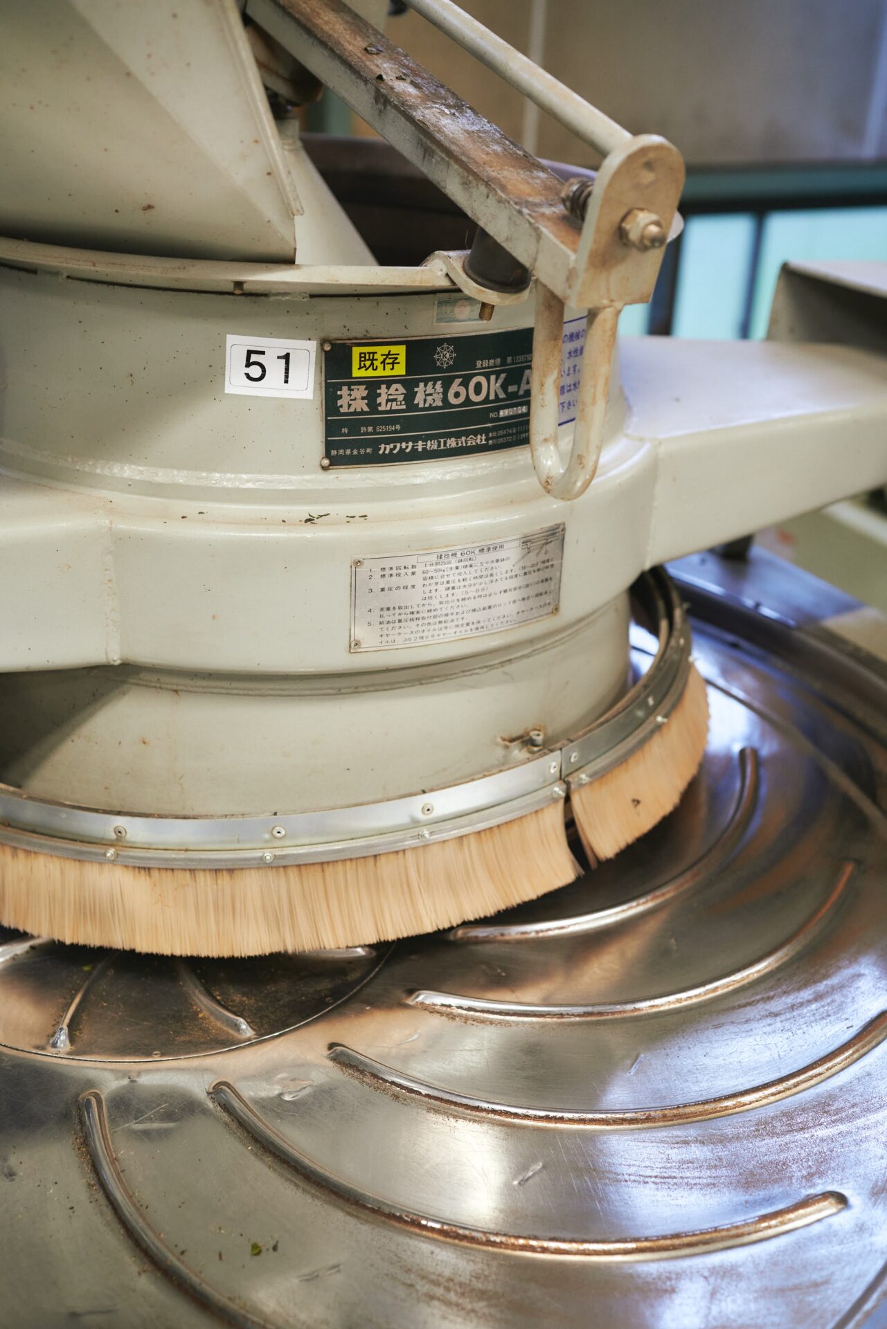 次に大きなブラシのようなもので茶葉を水平方向に「横揉み」。この特徴的な機械は「揉捻(じゅうねん)機」といい、茶葉をさらに揉み込むことで、内側から水分を絞り出していく。