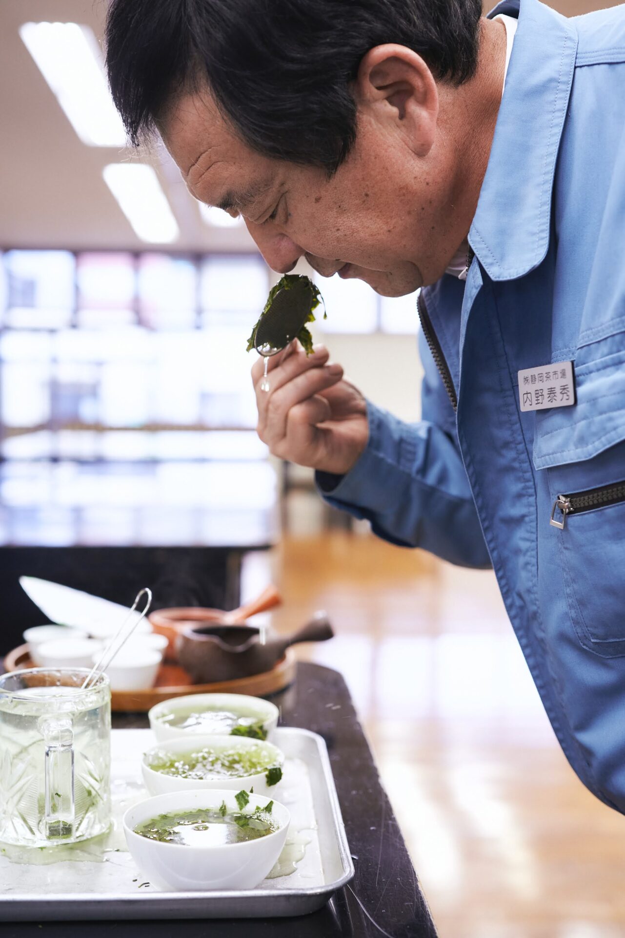 1種類のお茶につき、品質を見極めるまでの時間はわずか1分程度。ほぼ一瞬で、お茶の品質や製造工程を見抜かなければならない、長年の経験とたしかな審美眼が求められる工程だ。