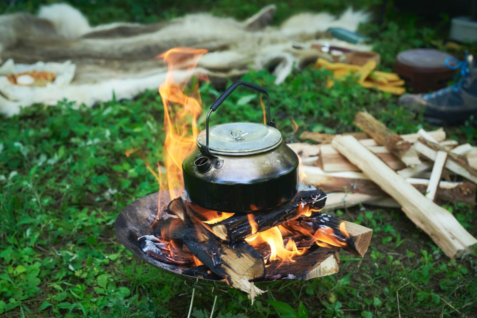 できた火種の上に薪を手慣れた様子で組み上げると、あっという間に焚き付けが完了し、安定した炎がゆらゆらと上がる。この上に水を入れたケトルを置いて沸騰させる。
