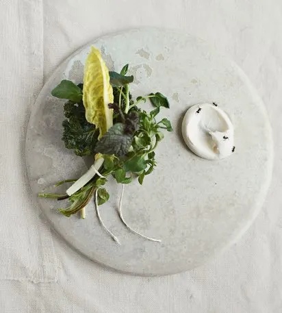 北欧産のハーブやクリームフレッシュを合わせているのですが、そこに酸味があるものも欲しいと考えた時に、北欧ではレモンなどが採れないため、代わりに現地のアリを散りばめたんです。