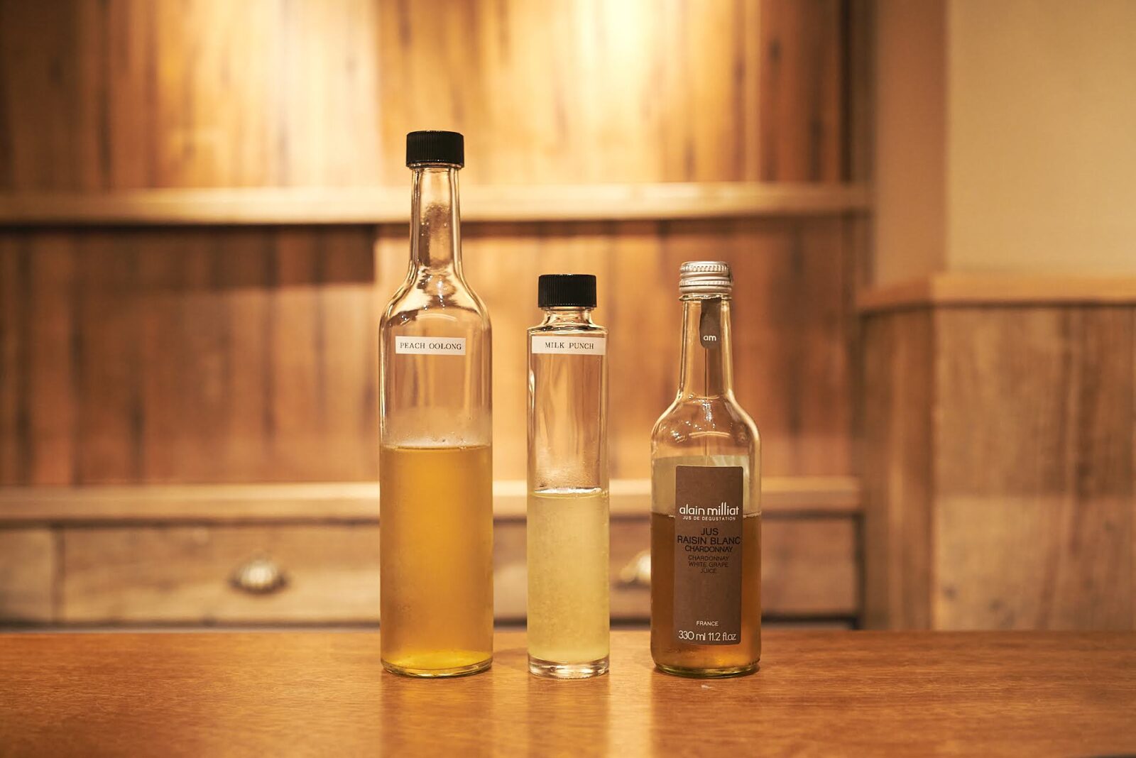 南雲さんは、今までにない味わいを生み出すため、自家製リキュールは各店舗に30種以上、先のモクテルに使用した白桃烏龍などの副材料も含めれば、各店舗に100種以上の素材を常備する。