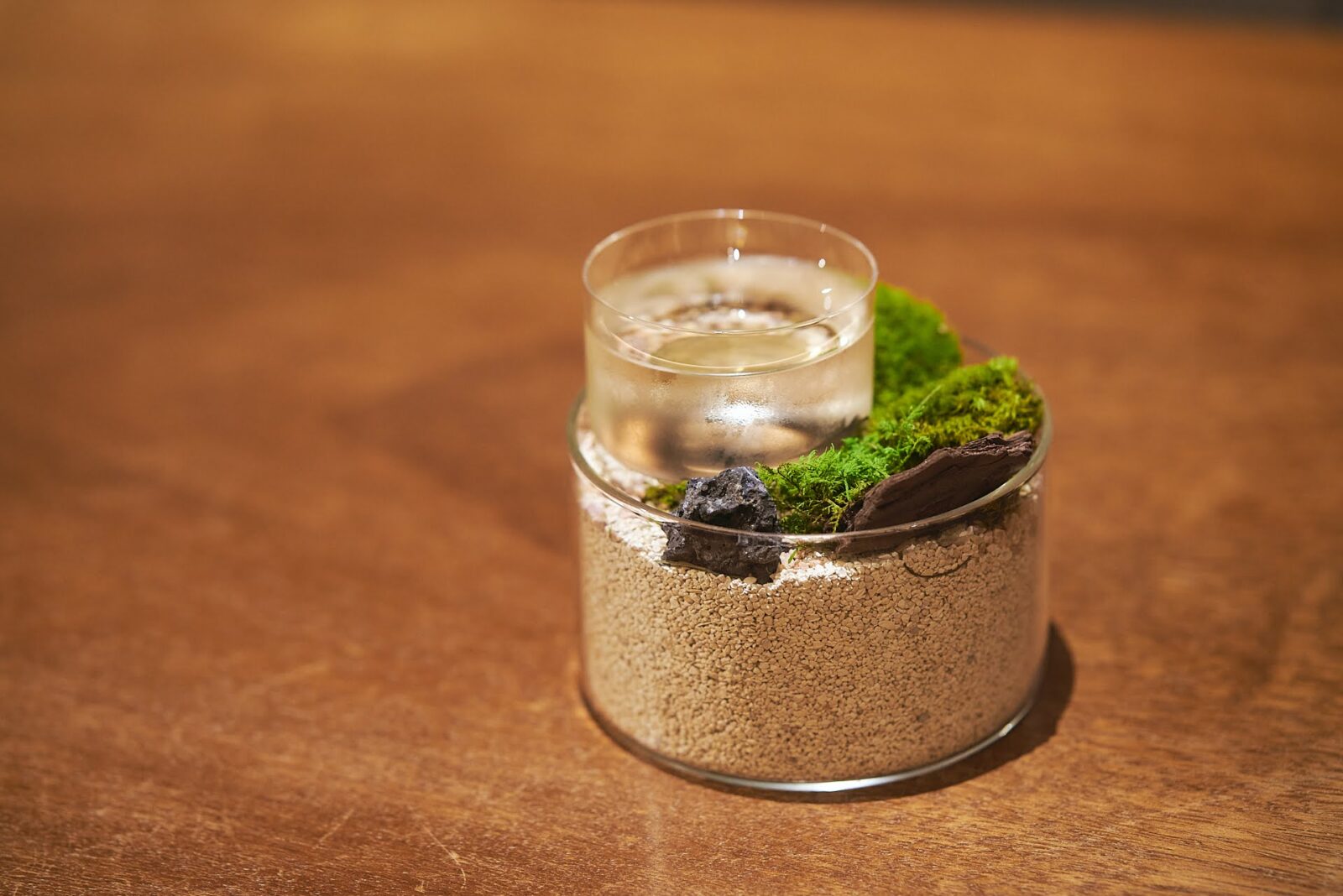 砂や苔などで小さな庭園が模られたグラスで提供される。