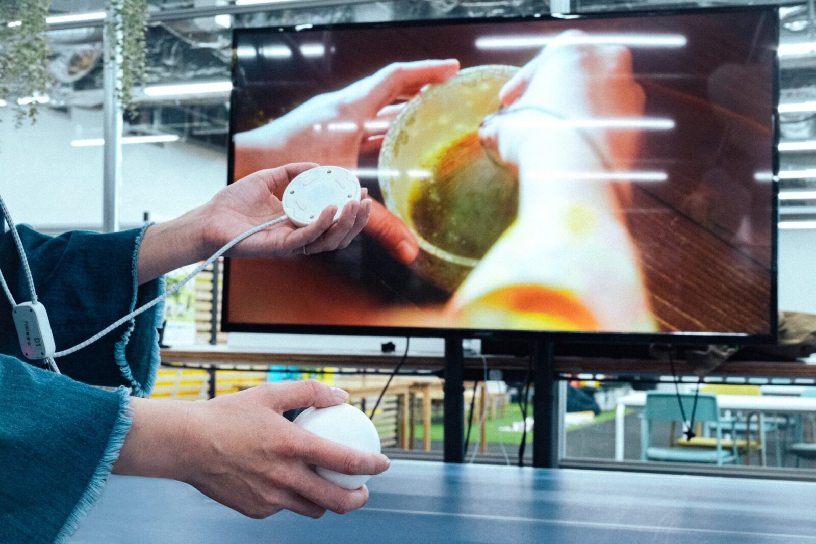現在は映像と連動したコンテンツの体験を通して、琴の演奏や、抹茶を点てるような繊細な触覚を共有することを実現しています。