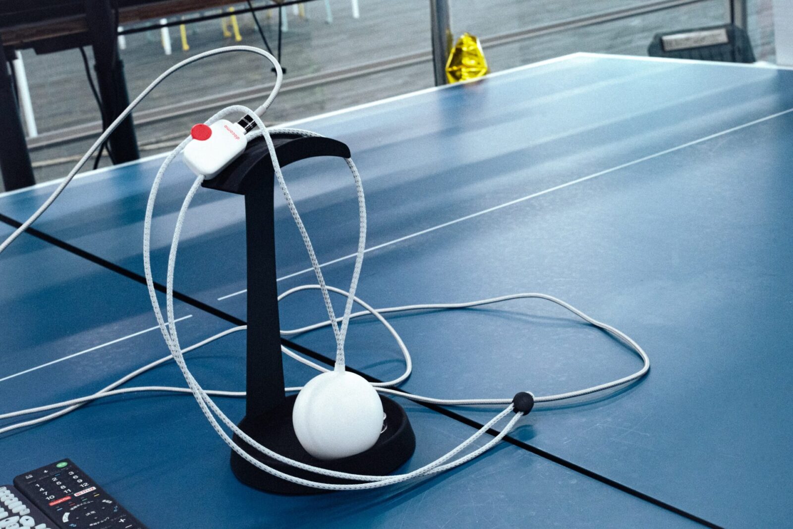 e-Rubberという特殊なゴム素材を駆動することで、右の人の脈動を、緑の風船を通じて感じることができる。KMDと豊田合成株式会社との共同研究により開発された
