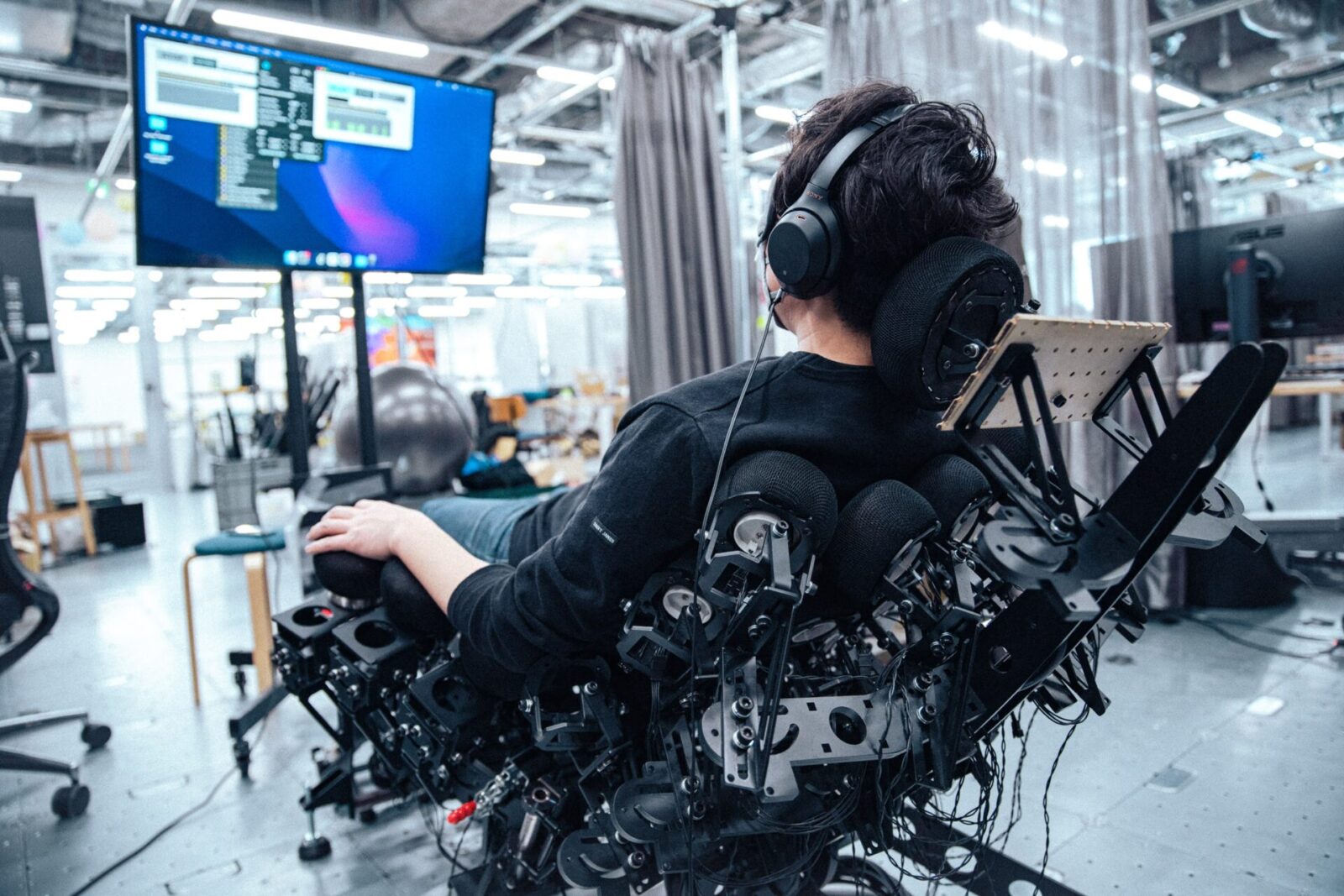 Enhance社が開発した、Synasthesia X1-2.44 という、44個の振動子から成るリクライニングチェアに座っていただき、目を閉じて、誰かがどこかを歩いているような音やその周りの環境の音とともに、肩や背中、足など全身にわたる触覚を与え、その世界に没入してもらいます。
