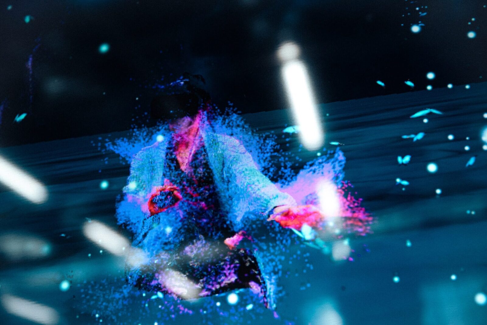 ヘッドマウントディスプレイを装着すると、外部のカメラで捉えられた自分自身が映し出されます。その周囲には、なにかオーラのようなものが見えます。