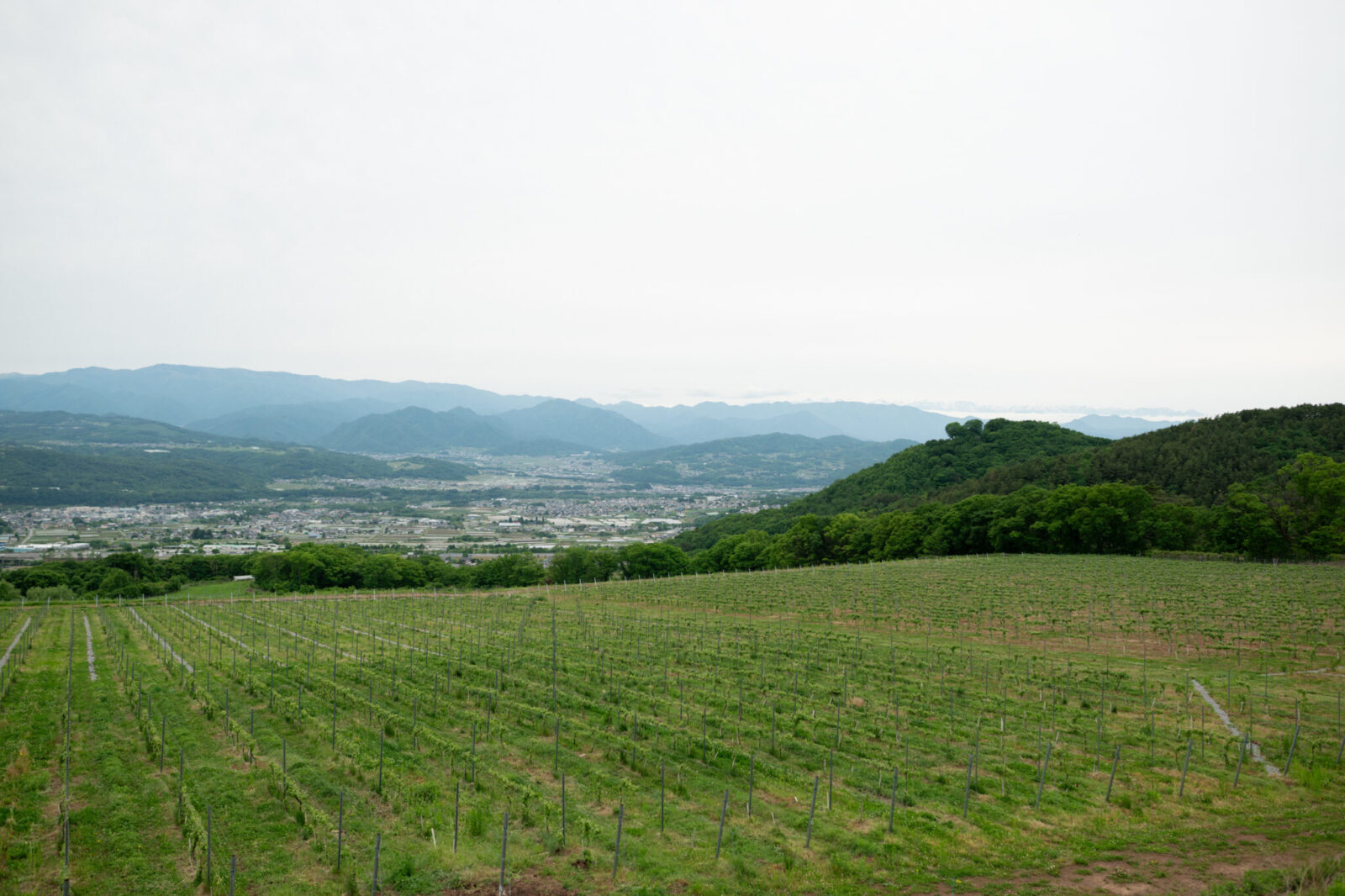 なだらかな丘の上にあるブドウ畑。開けた視界の向こうには雄大な山々がそびえ立ち、眼下には千曲川と上田の街並みが広がっている。きれいに整列したブドウの樹々は伸び盛りで青々と葉を繁らせ、広い空の下にそよそよと畑を流れる風が心地良い。