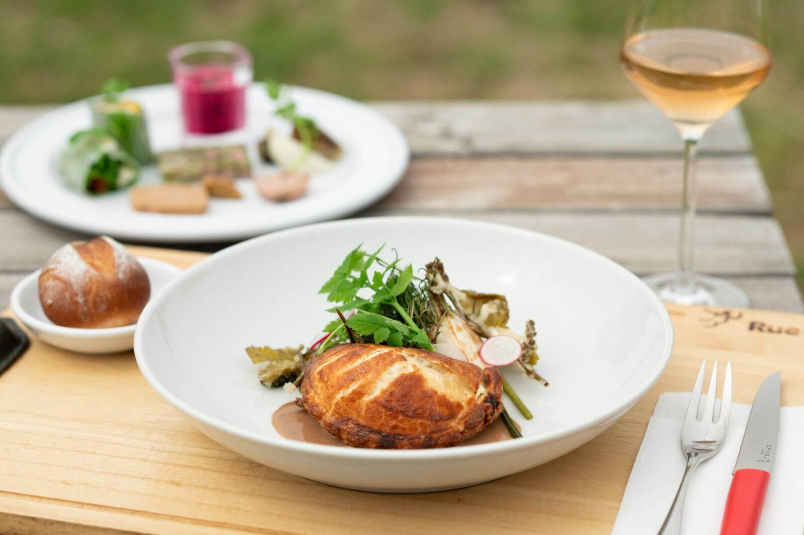 リュードヴァンには、レストランや宿泊施設もある。ブドウ畑のすぐ脇で緑に囲まれながら、この土地の素材を生かした料理とワインを一緒に楽しむ食事は、至福のひとときとしか言いようがない。