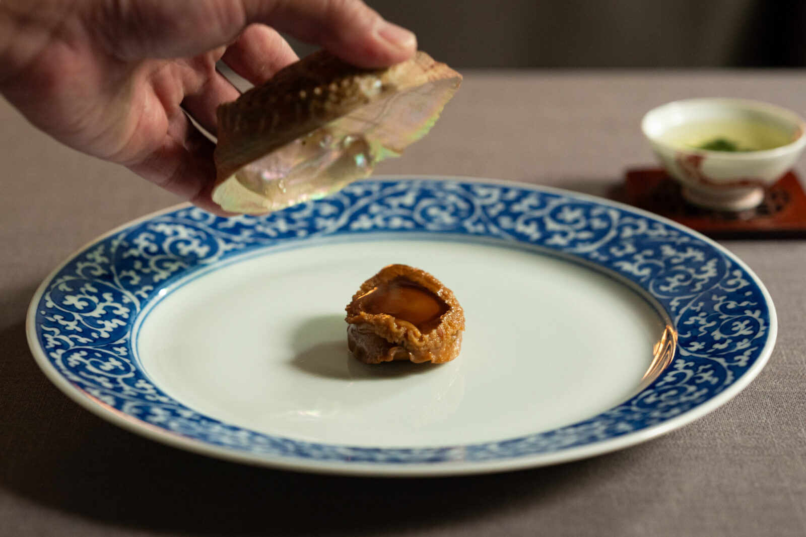 「昆布など海藻を食べて育つ鮑と、昆布の相性はとてもいいんです。鮑のソースは、炊いた際のスープを澄ませて、調味料は紹興酒だけ。全ての素材を出し切って澄ませることで“淡味”を引き出しているので、濃く感じず、干し鮑と金華ハムから出た塩みがほどよく感じられると思います」