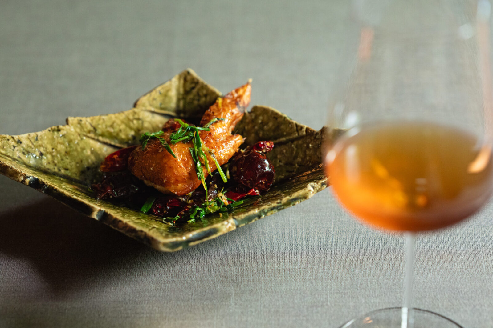 薄い皮に歯をかけると、パリパリッと音を立てる「辣子鶏」は、唐辛子に燻されるように香りをまとい、滲み出るジューシーな旨みに惚れ惚れ。「正山小種(ラプサンスーチョン)」のスモーキーな味わいと重なり、「圧倒的な味のマリアージュ」と川田シェフも絶賛する組み合わせ。