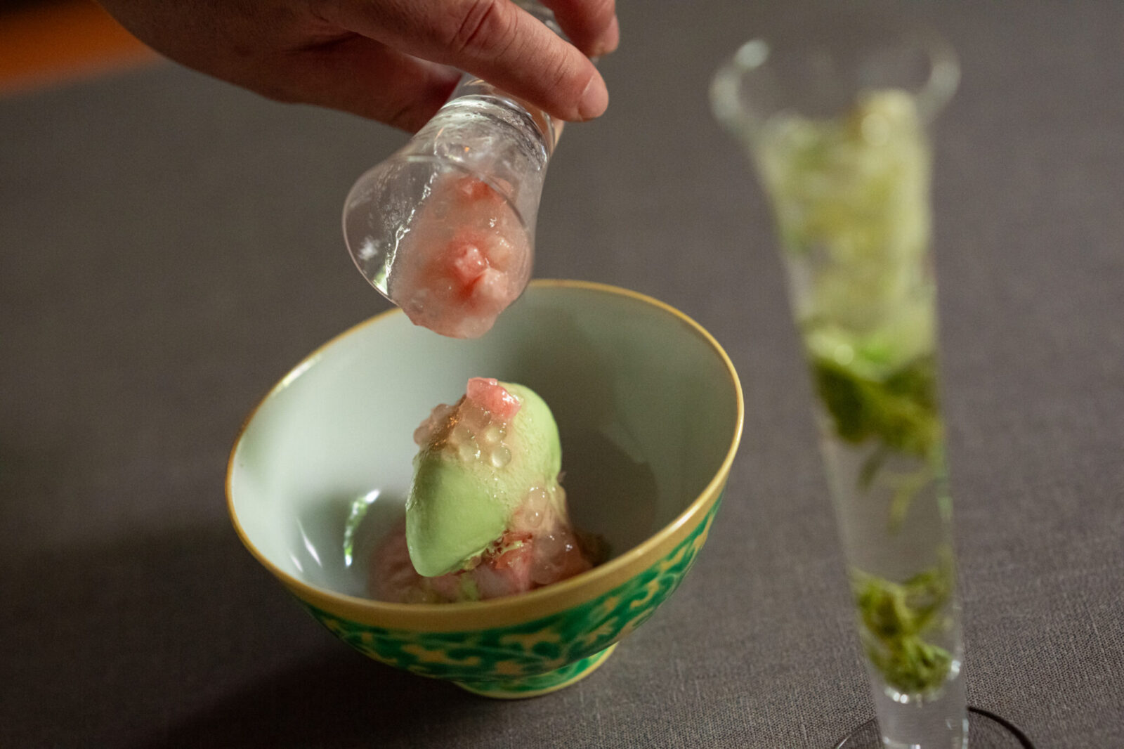 香港発祥のデザート「楊枝甘露(ヨウジカンロ)」を、旬の桃と、大葉と生姜のアイスクリームで表現。合わせるのは、静岡産のフレッシュなジャスミンティーと、四川省の緑茶「蒙頂甘露(モウチョウカンロ)」のブレンドティー。