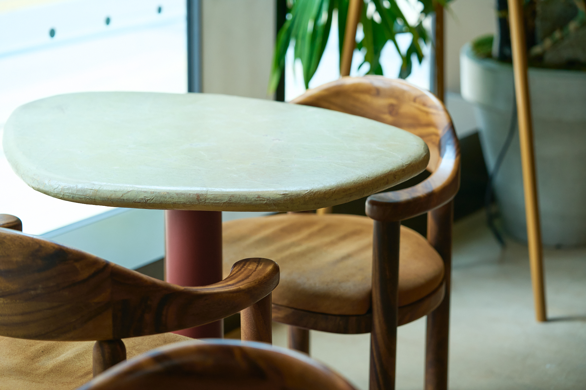 ほかにも、店内の照明は水面に光る海藻を見て美しいと感じたことから、福岡のANON LIGHTINGに海藻をすき込んだ和紙を作ってもらったもの。テーブルの天板は、和紙職人のハタノワタルさんの手によるものだ。