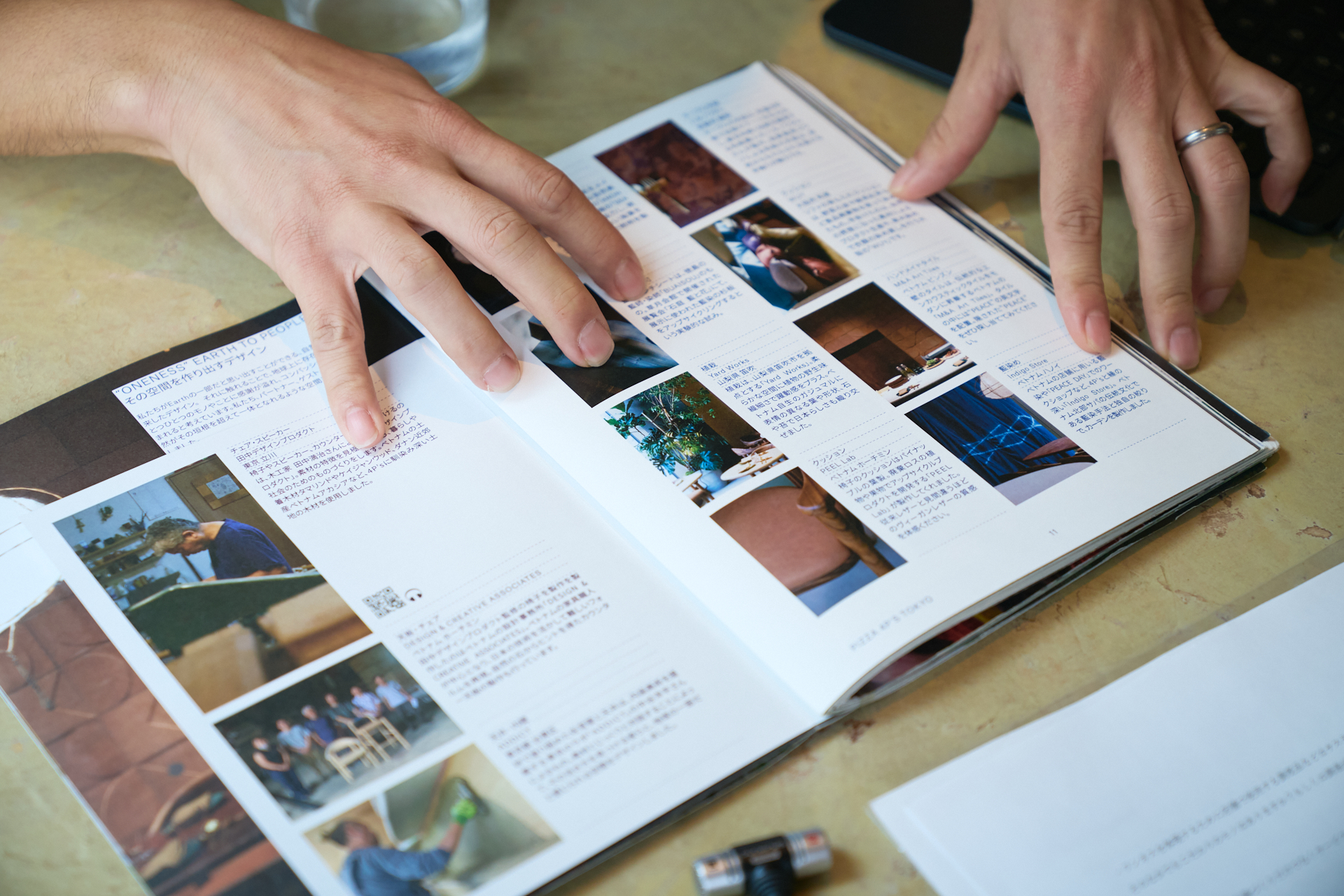 もうひとつ、メニューブックの製作にあたって意識したのは、フードやドリンクに紐づく生産者と同じ熱量で、内装や家具、テーブルウェアなど飲食に直接関係のないパートナーまで網羅的に取り上げること。