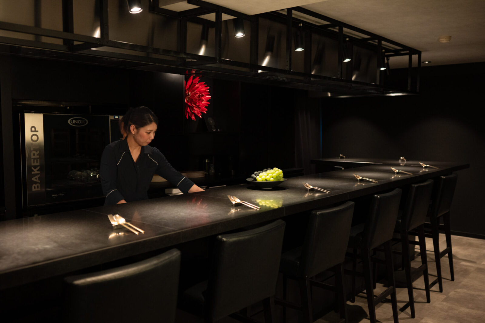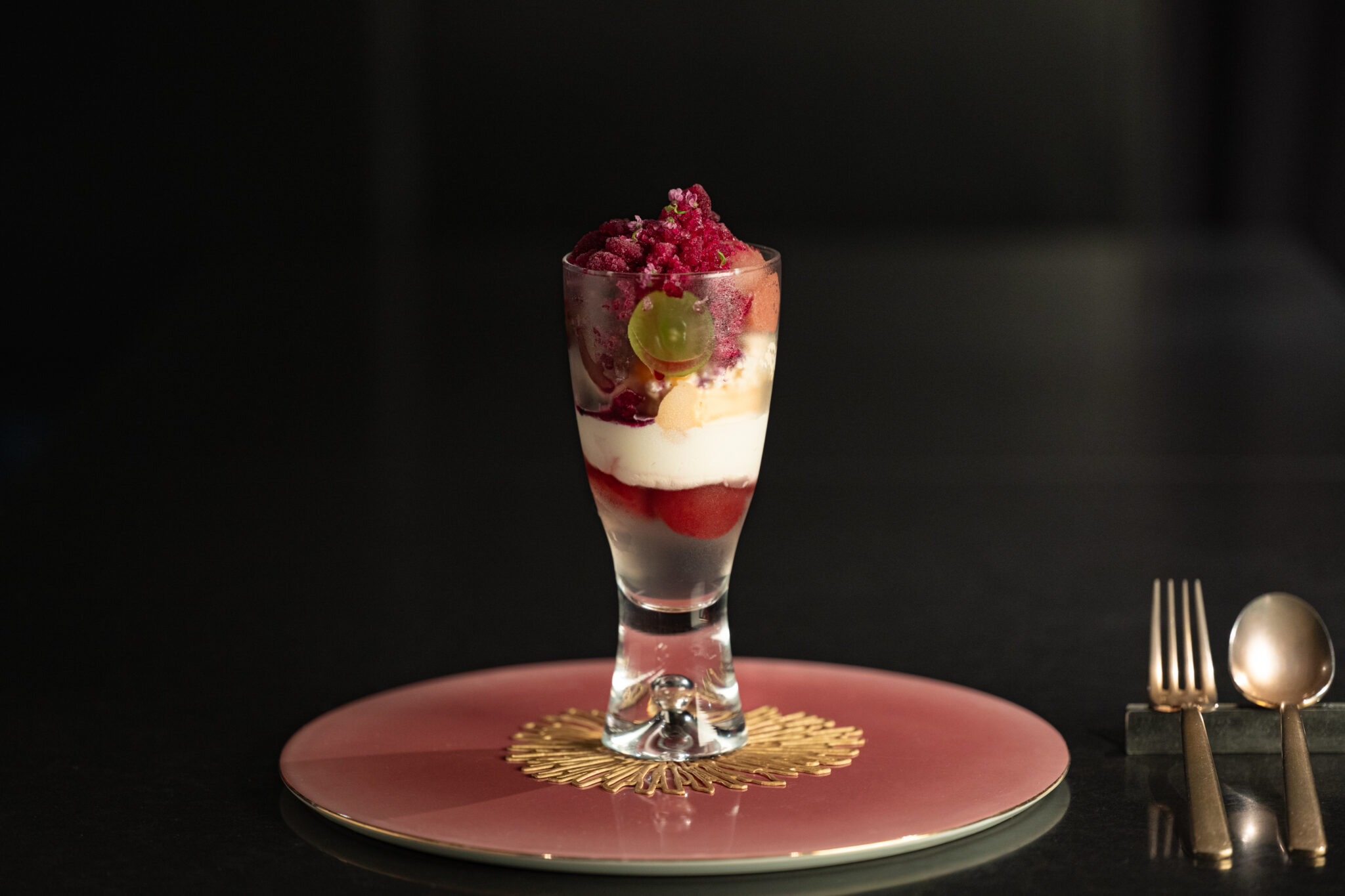 黒を基調とした店内で、艶やかなフルーツが華を添え、目の前でパフェやショートケーキが組み立てられていくさまは、まるでインスタレーションを鑑賞しているかのようだ。