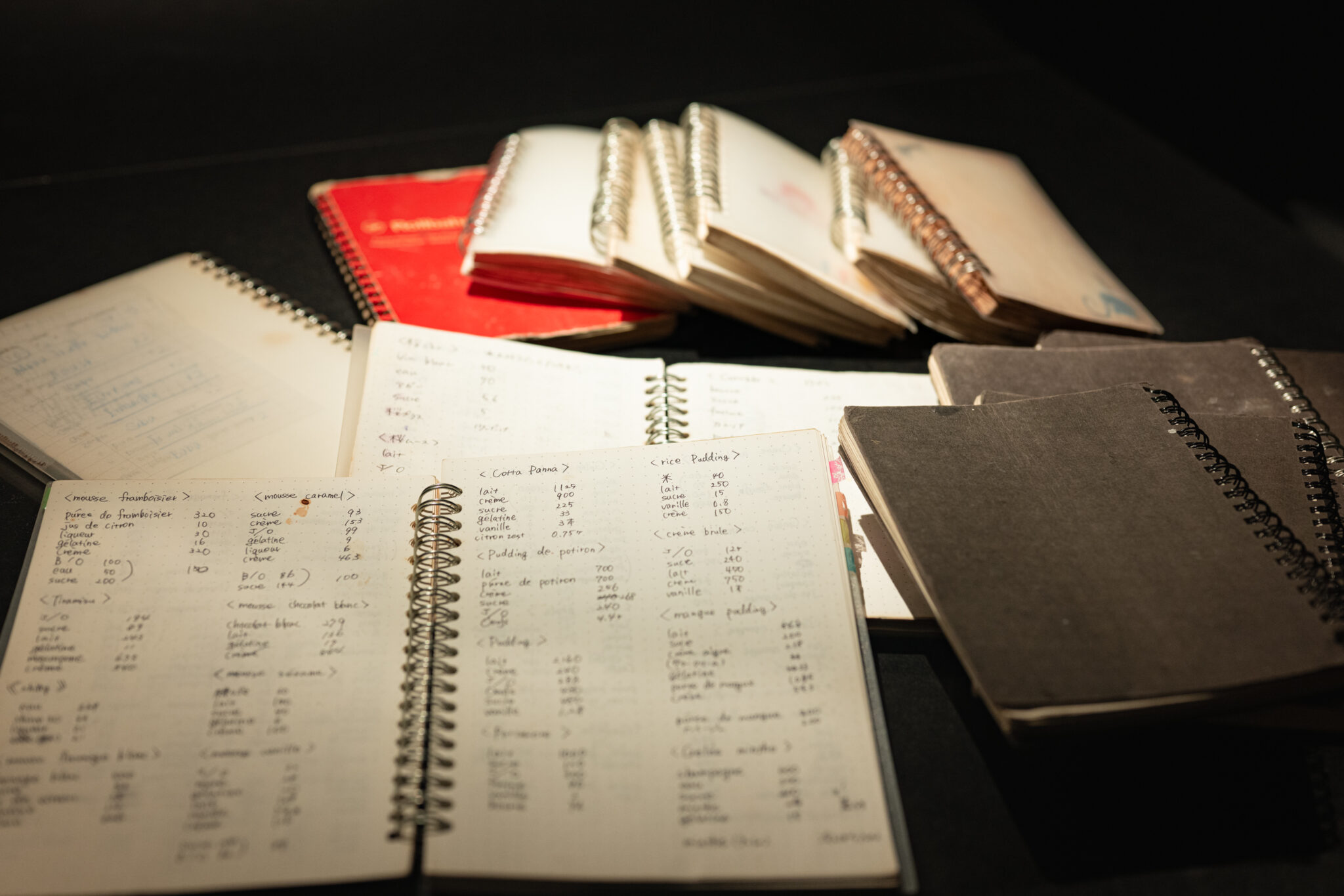 「単なるレシピ帳ではなく、配合やアイデアを絵と文字で記録したものです。私はだいたい絵で覚えているので、例えば、あのときのリコッタチーズの配合は、あの職場のノートに描いたはず…という記憶で、引っ張り出せるんです」