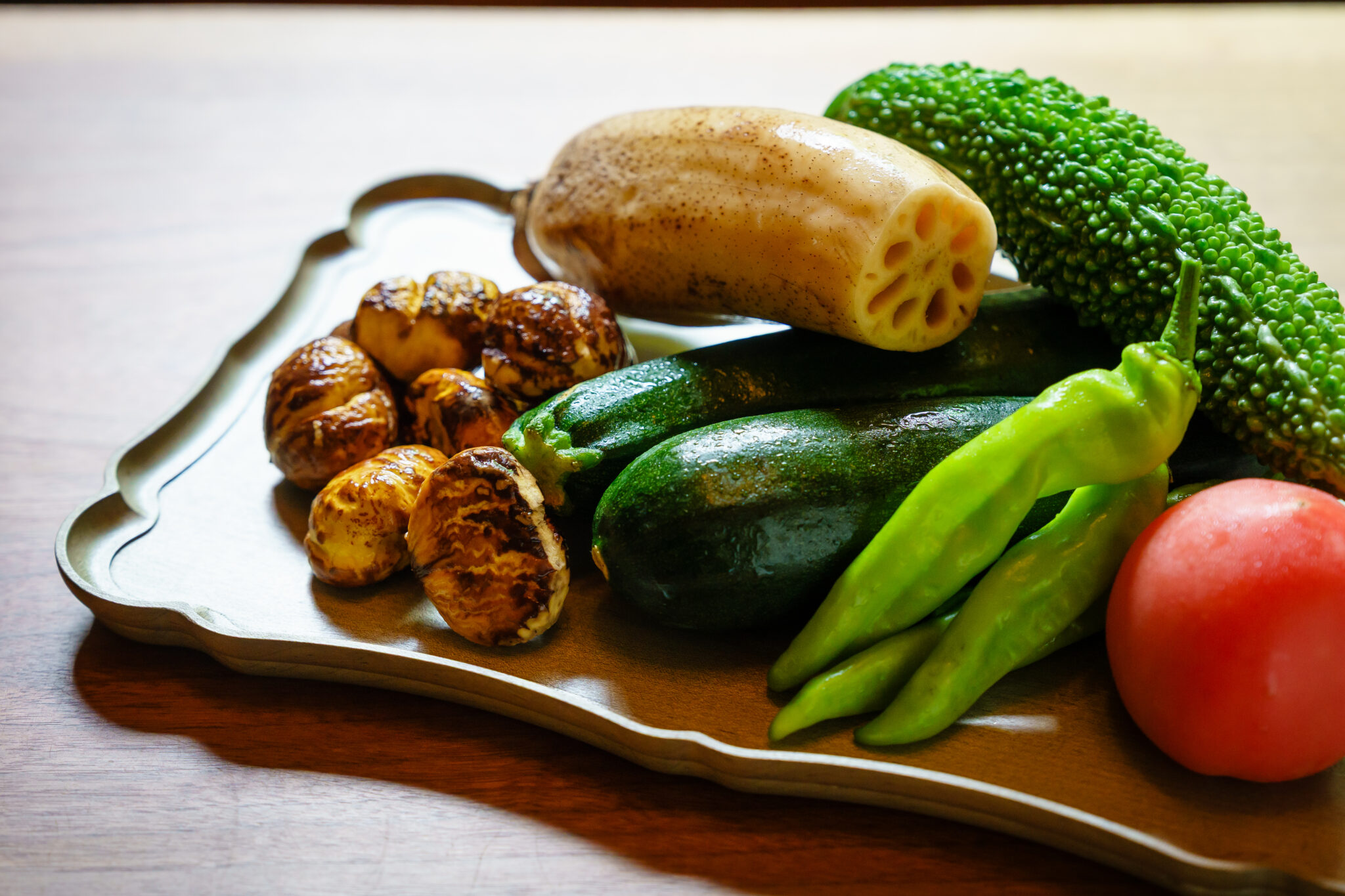 ピューレにした万願寺唐辛子のソースの上にじゃがいものガレット、さらに薄くスライスしたゴーヤと万願寺唐辛子を載せる。そこに和歌山の蔵光農園から届いた翡翠みかん。