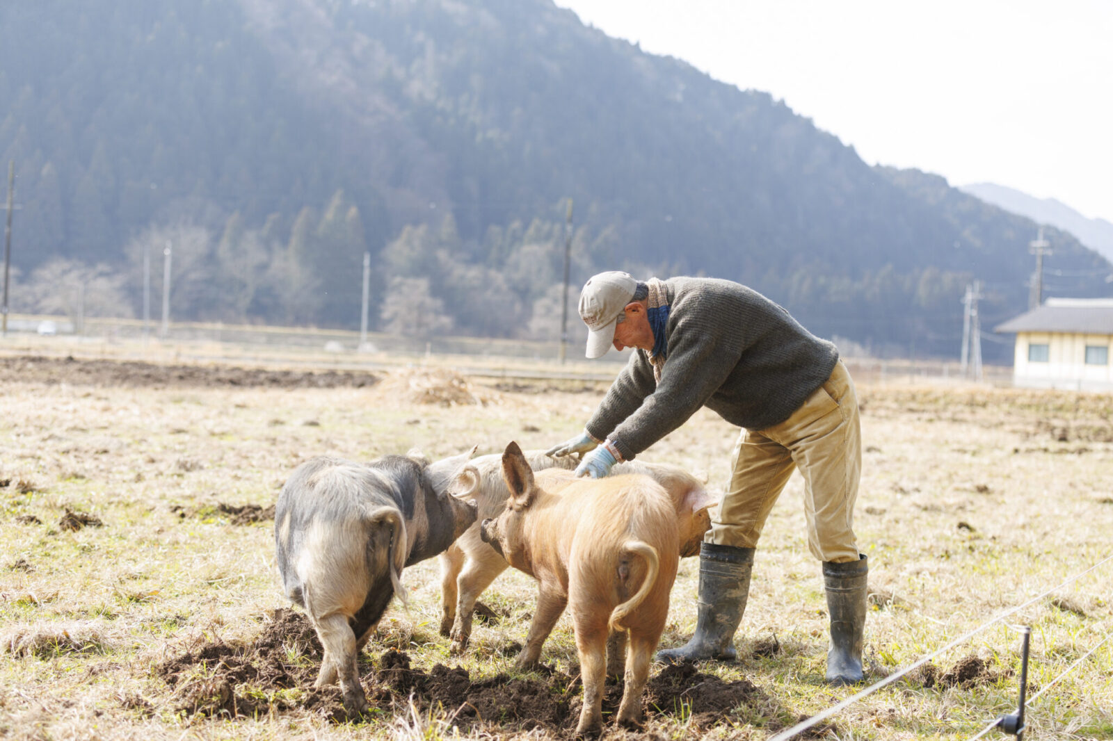 ここでは、耕作されなかった農地に放牧した豚が、草や土に埋まった根を食べて、農地再生に一役買っている。他にも、蒸したさつまいもやくず米、野菜を餌に、健やかに育てられている。