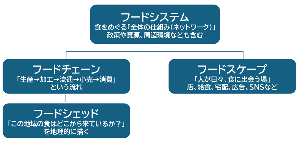 まず「いま自分は何について(どの視点で)考えようとしているのか」を確認してみましょう。つまり、「この話はフードチェーンの話なのか、フードシェッドの話なのか、フードスケープの話なのか。あるいは、より大きなフードシステムに関する話なのか」をちょっと振り返ってみましょう。