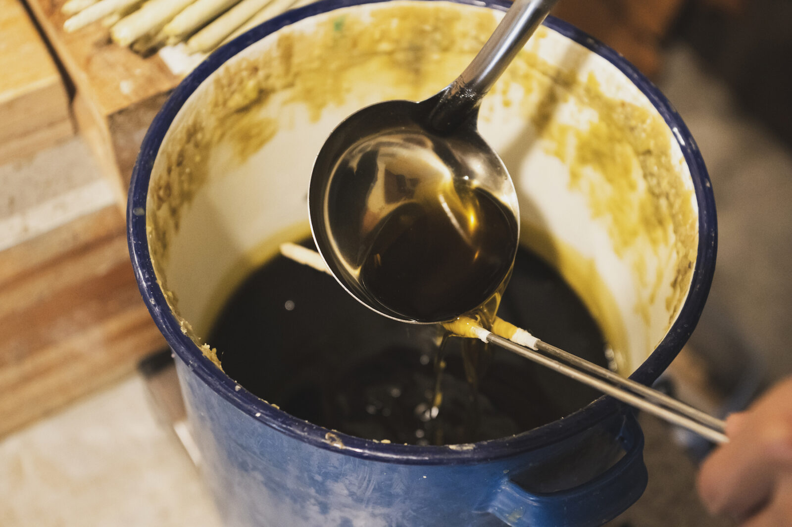 He also got in touch with Araki Seiryo, a Japanese candle maker in Fukuoka Prefecture that has been in business since the Edo Period. They let him study their process and introduced him to companies that manufacture haze wax and candle wicks.