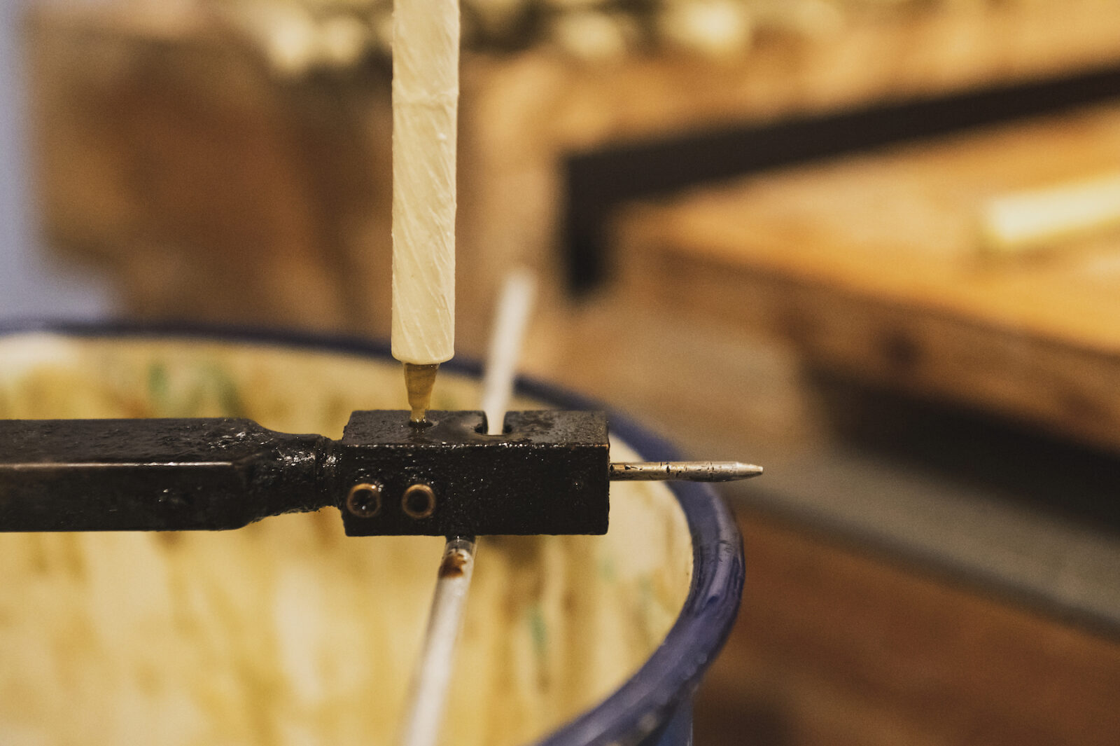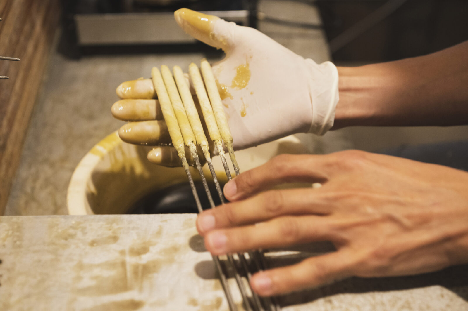 The most distinctive process of making Japanese candles is that the wick is covered with wax by hand. The first step is to skewer the wick, which is made of Japanese paper wrapped in igusa pith and cotton. Next, wax is poured on the wick and left to dry.