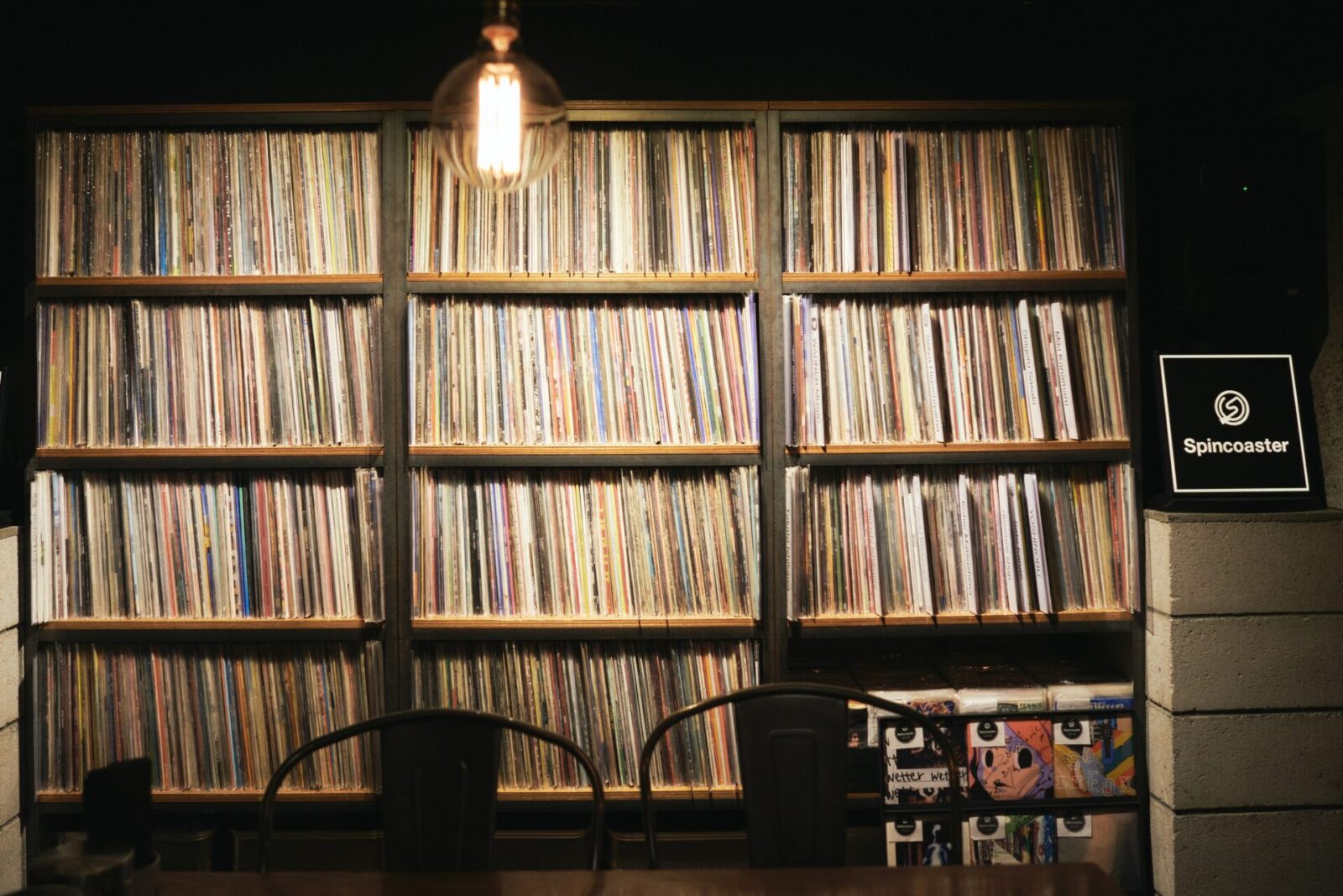 The Spincoaster Music Bar has a shelf that holds onto vinyl records for their member customers.