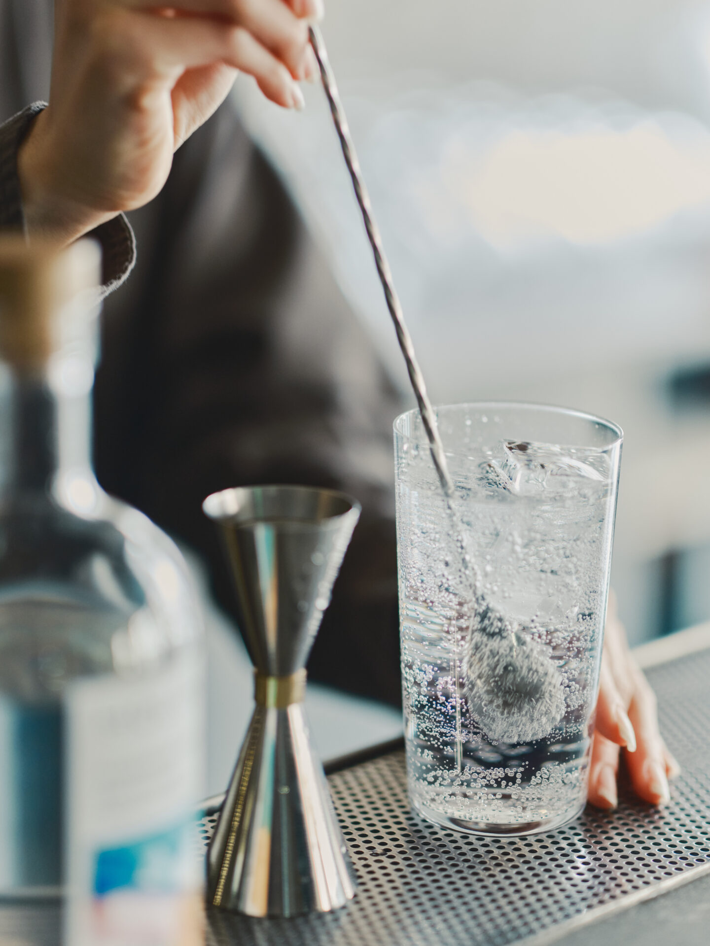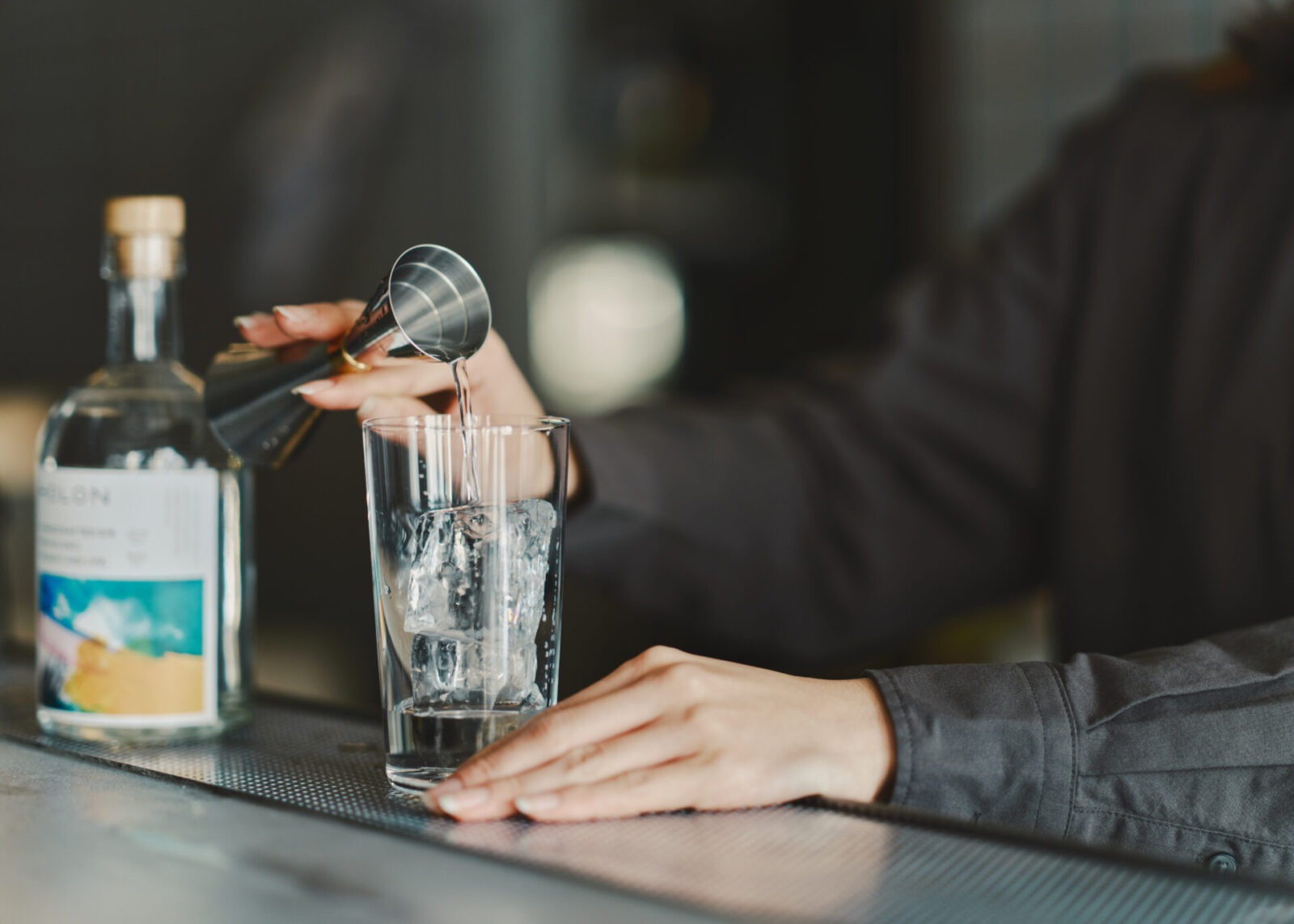 The sound of a clear, colorless gin gently pouring into a glass echoes quietly through the room.